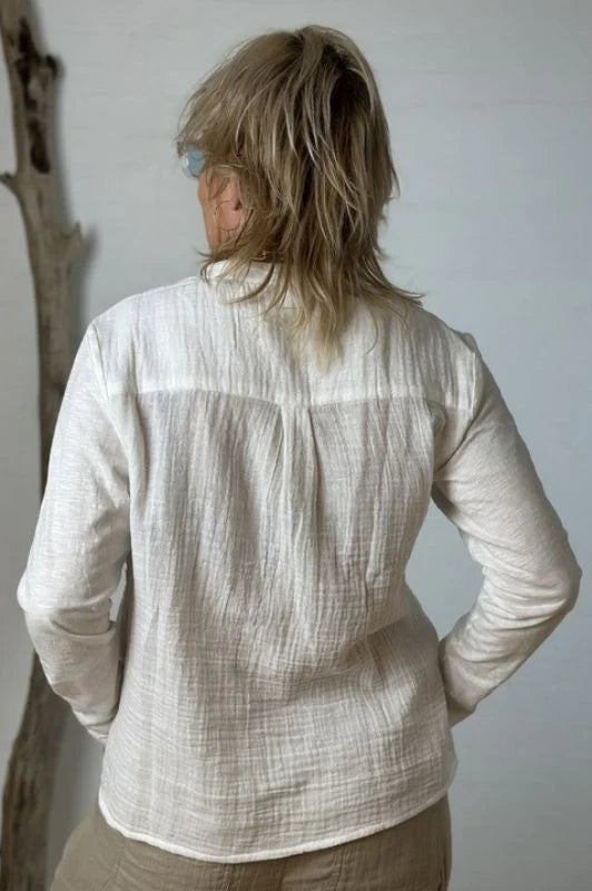 Selve kroppen er syet i let og blød gauze-bomuld med et naturligt, let krøllet look, der giver blusen et afslappet og levende udtryk. Den har en enkel krave med V-udskæring og stolpelukning til under brystet, afsluttet med smukke guldknapper, som tilfører et raffineret præg.