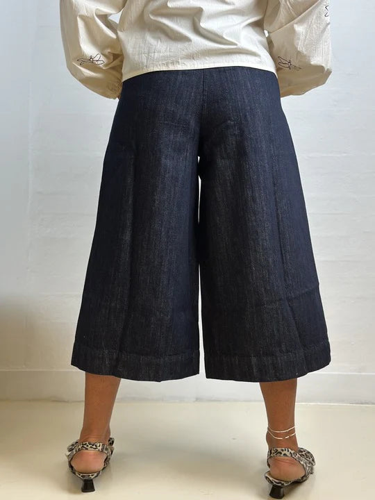 Flot Culotte buks fra Gaspar i mørk denim. Buksen sidder til i livet og har brede ben, der stopper omkring skinnebenet. Det anderledes snit giver culottebuksen et cool udtryk, der er fedt at style med en høj støvle.