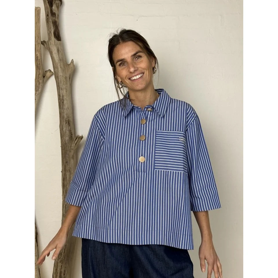 Porto Blouse er en moderne stribet skjorte til kvinder med et afslappet og tidløst udtryk. Denne version er designet i blå med fine hvide striber, som giver et klassisk og friskt look, mens guldfarvede knapper og et diskret logobroderi tilfører et eksklusivt og feminint præg.